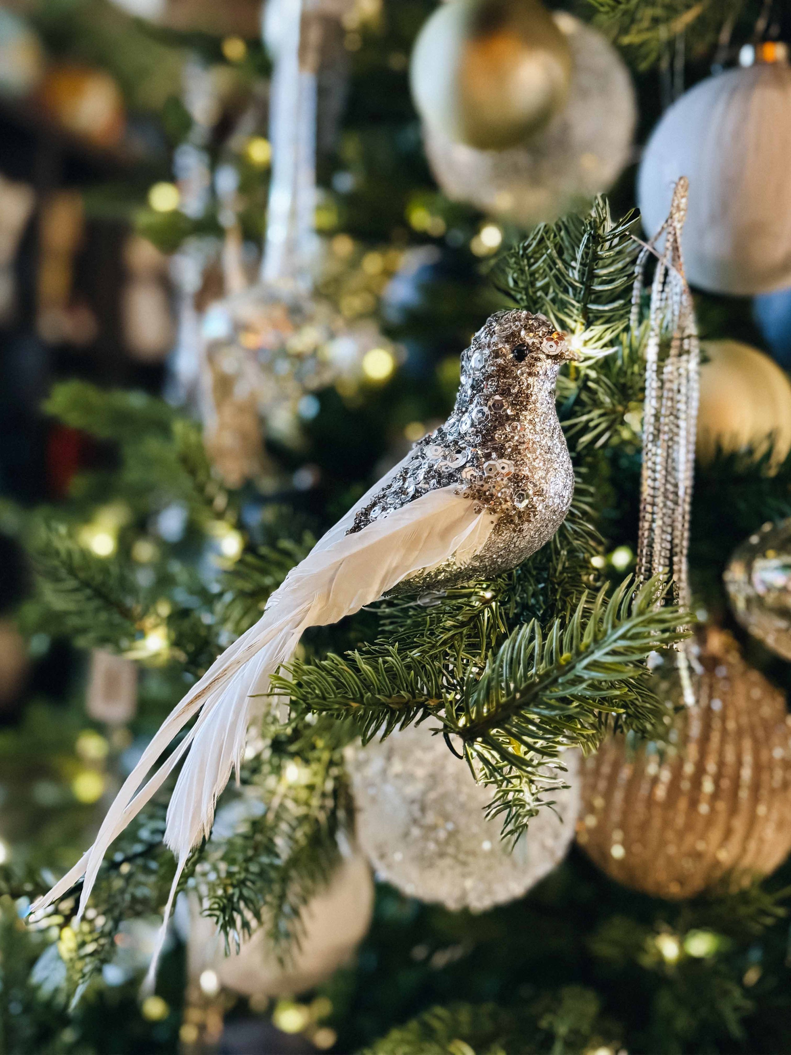 Це вже класична історія, але полюбилась вона багатьом. Акцентні зони на ялинці, які переливаються різними кольорами при заломах світла. Такі прикраси додають одразу глянцевого обрамлення та сучасної роскішності.